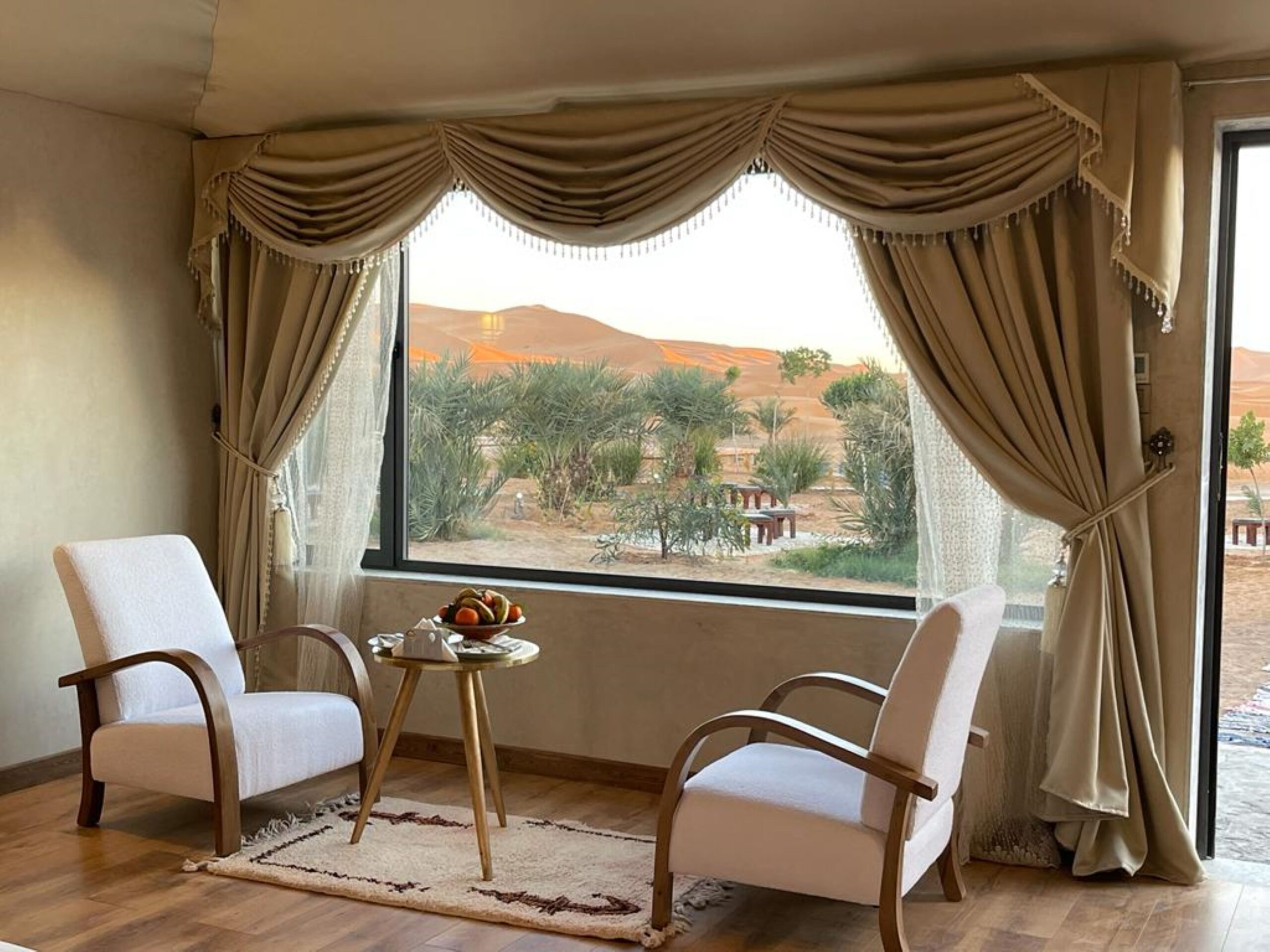 Notre bivouac est constitué de tentes nomades luxueuses et suites Royales entièrement équipées pour vous offrir un confort optimal. Les tentes sont spacieuses, élégantes et décorées avec des tapis marocains traditionnels et des meubles